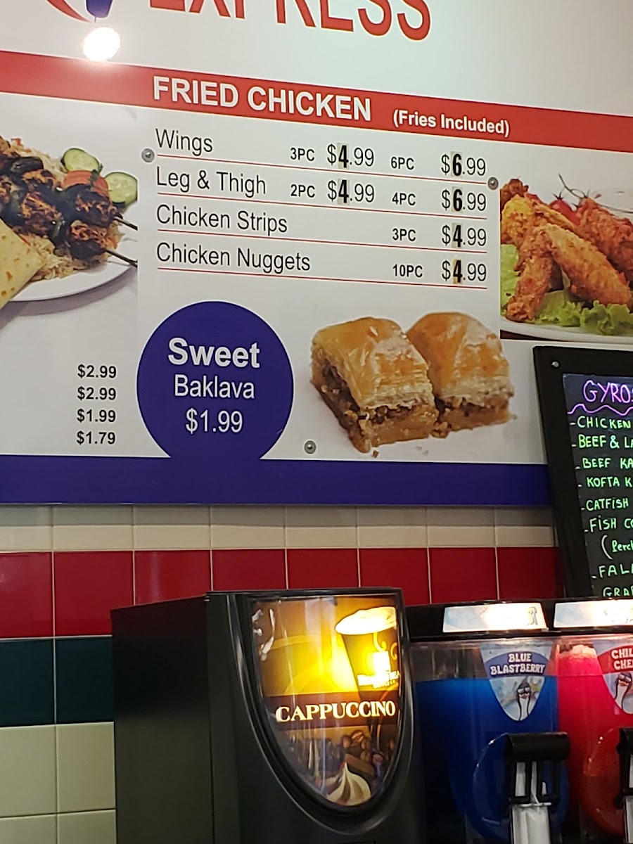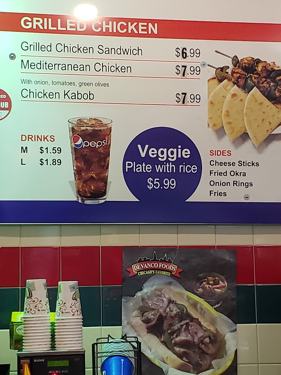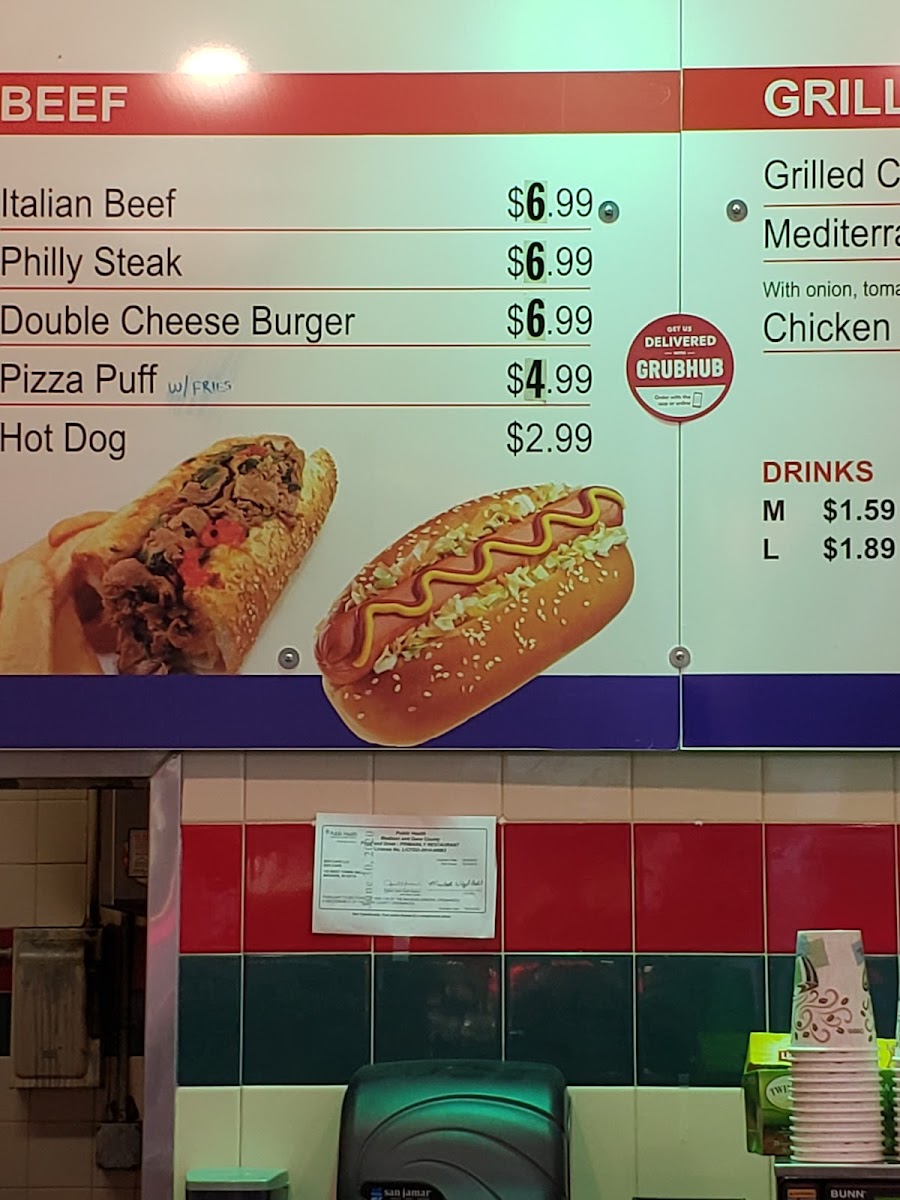 Those craving comfort food will find plenty to enjoy in the fried chicken section, including Leg & Thigh, Wings, Chicken Strips, and Chicken Nuggets. The “East Meets West” lineup-Beef Kabob, Kofta Kabob, Chicken Shawarma, and Lamb and Beef Shawarma-highlights the restaurant’s Mediterranean roots, while classic American favorites like Italian Beef, Pizza Puff w/ Fries, Hot Dog, Double Cheese Burger, and Single Cheese Burger round out the experience.
